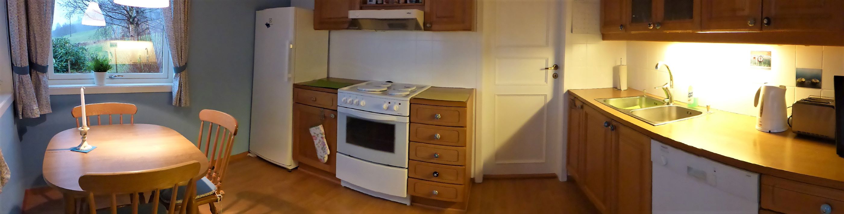 Gemütliche und komplett ausgestattete Wohnküche mit praktischem angrenzenden Vorratsraum.